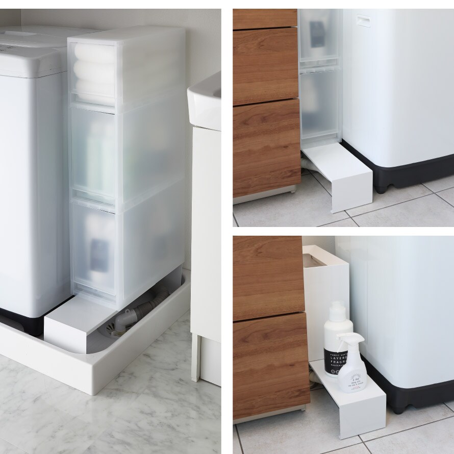 洗濯機の排水口とホースの上のデットスペースを有効活用「伸縮洗濯機排水口上ラック」。