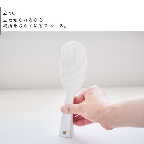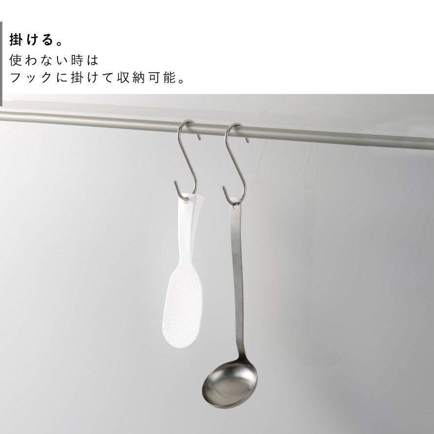 置き場所に困っても、立つ・置く・掛けると便利に収納できるスリムなしゃもじ。