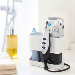 ごちゃごちゃしがちな洗面台まわりの小物類をスッキリ収納できるヘアアイロン&ドライヤー収納ホルダー。コード類も後ろのコード用フックに巻きつけて収納できます。