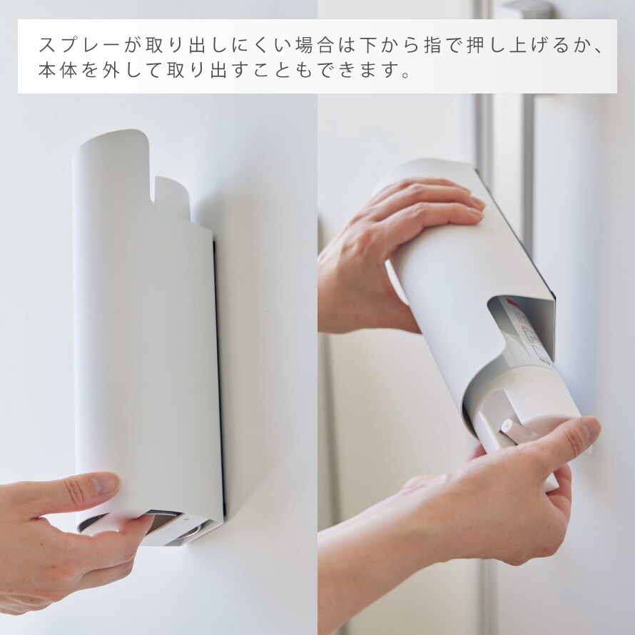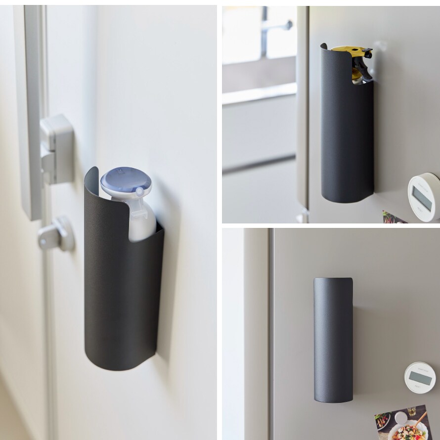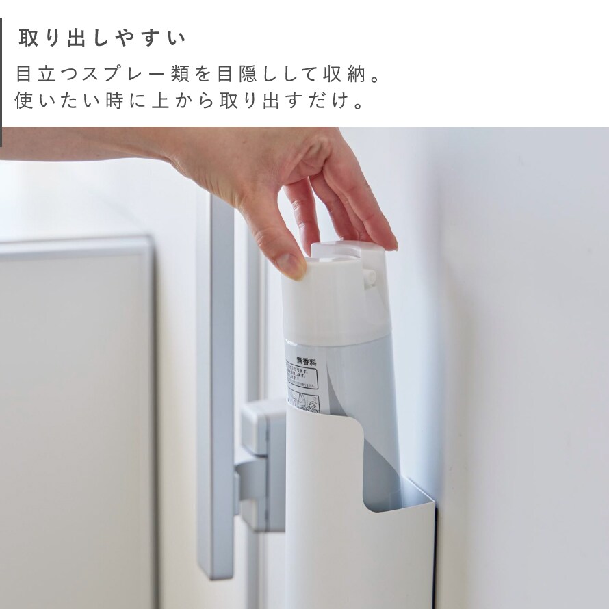 殺虫剤や消臭・防水スプレー、潤滑剤など様々な種類のスプレーを隠して収納。スプレーが取り出しにくい場合は下から指で押し上げると簡単に取り出すことができます。