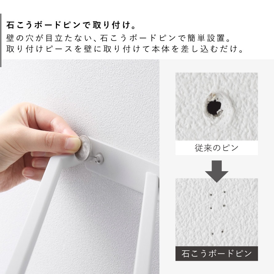 壁の穴が目立ちにくい石こうボードピンで部屋のコーナーの壁に取り付け可能。付属の木ネジでも取り付け可能です。
