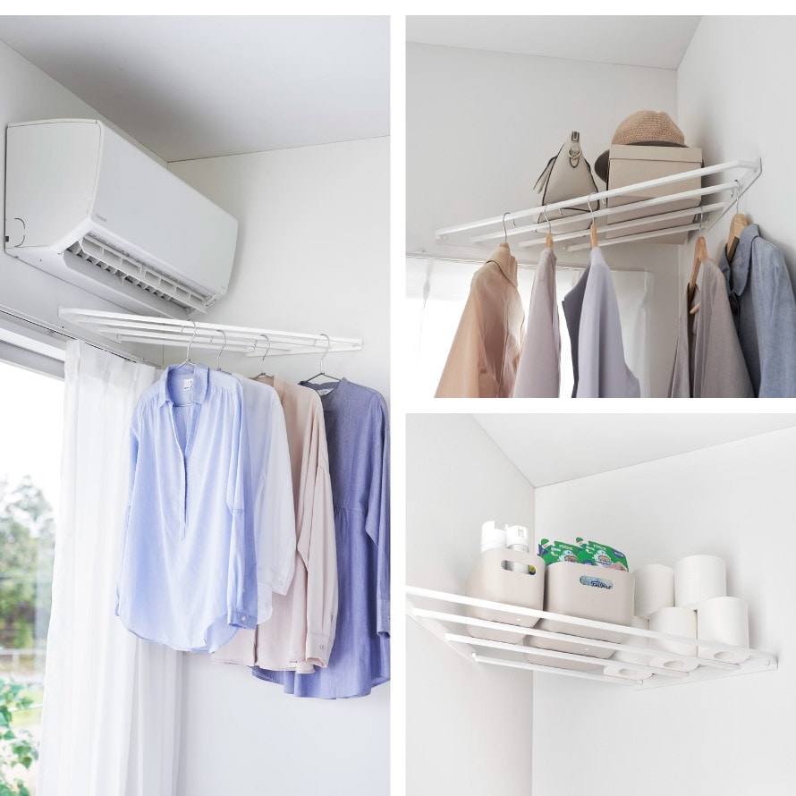 洗濯機周りやトイレ収納棚としての設置もおすすめ。エアコン周りに設置すれば花粉症対策や梅雨時期の部屋干しでも早く乾かすことができて◎。