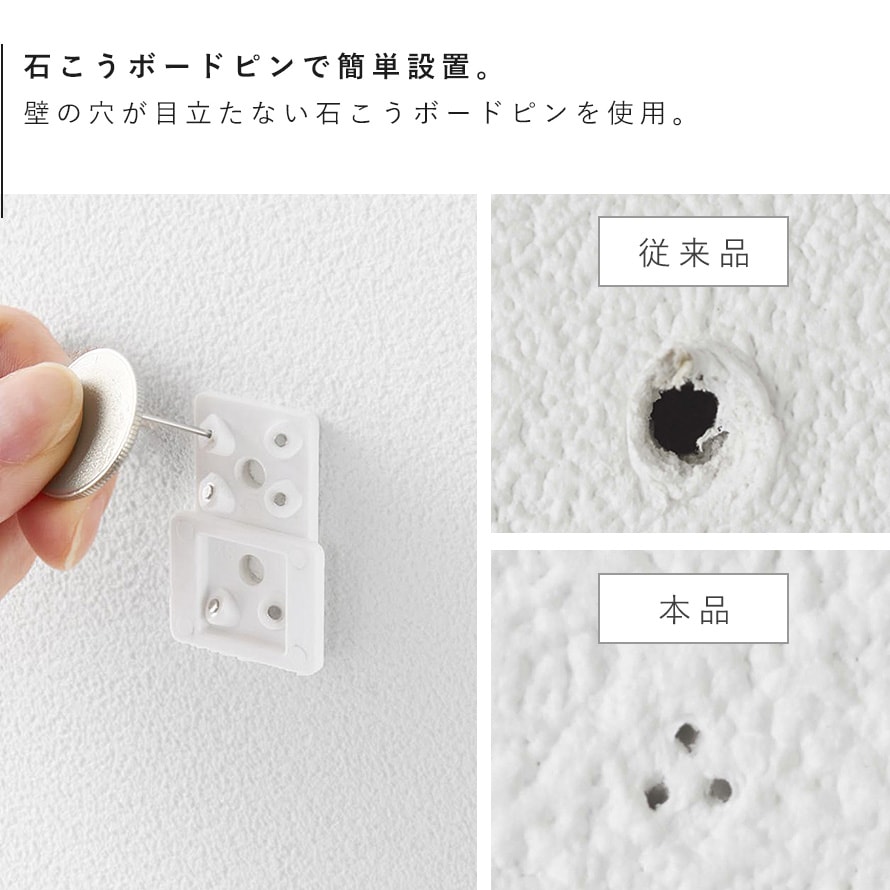 壁の穴が目立ちにくい石こうボードピンで簡単設置。
