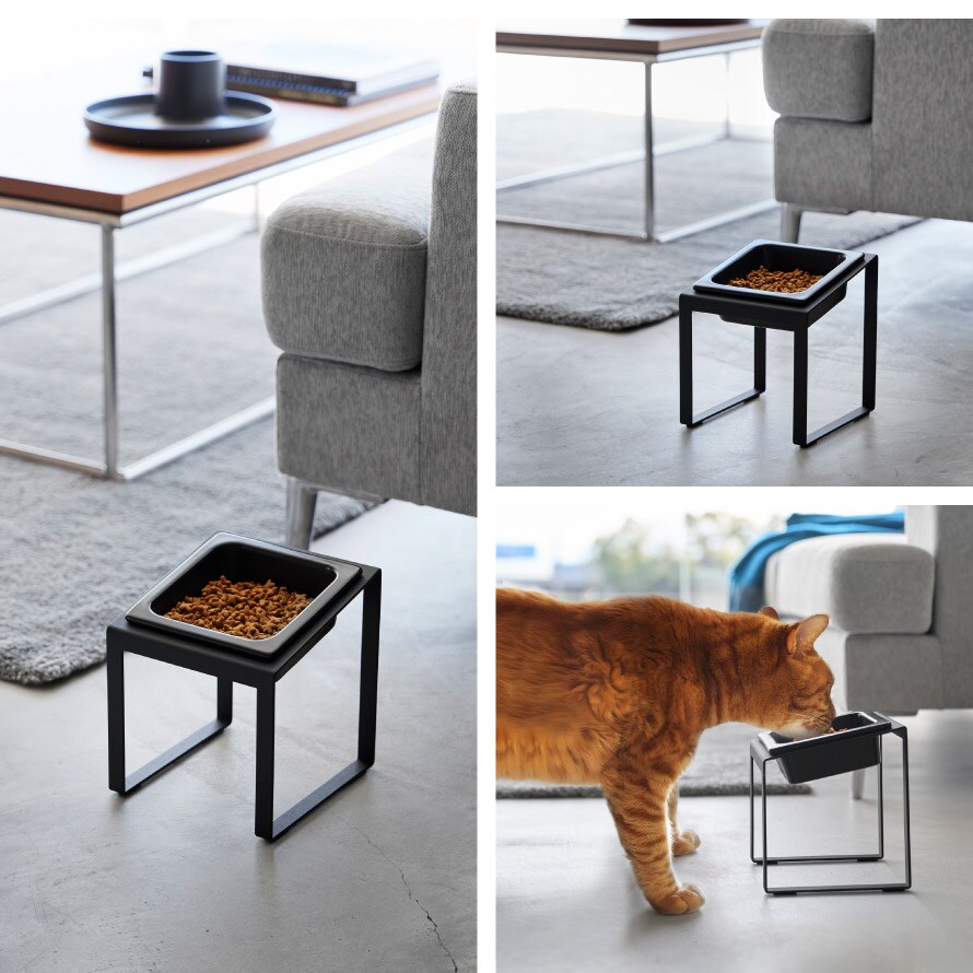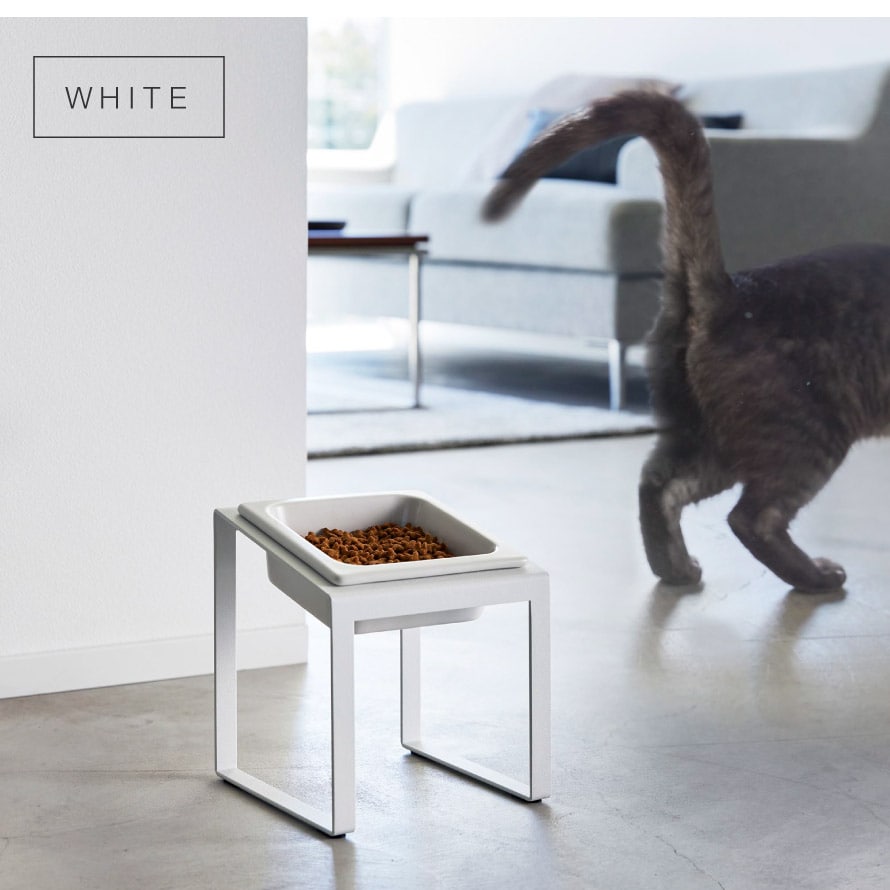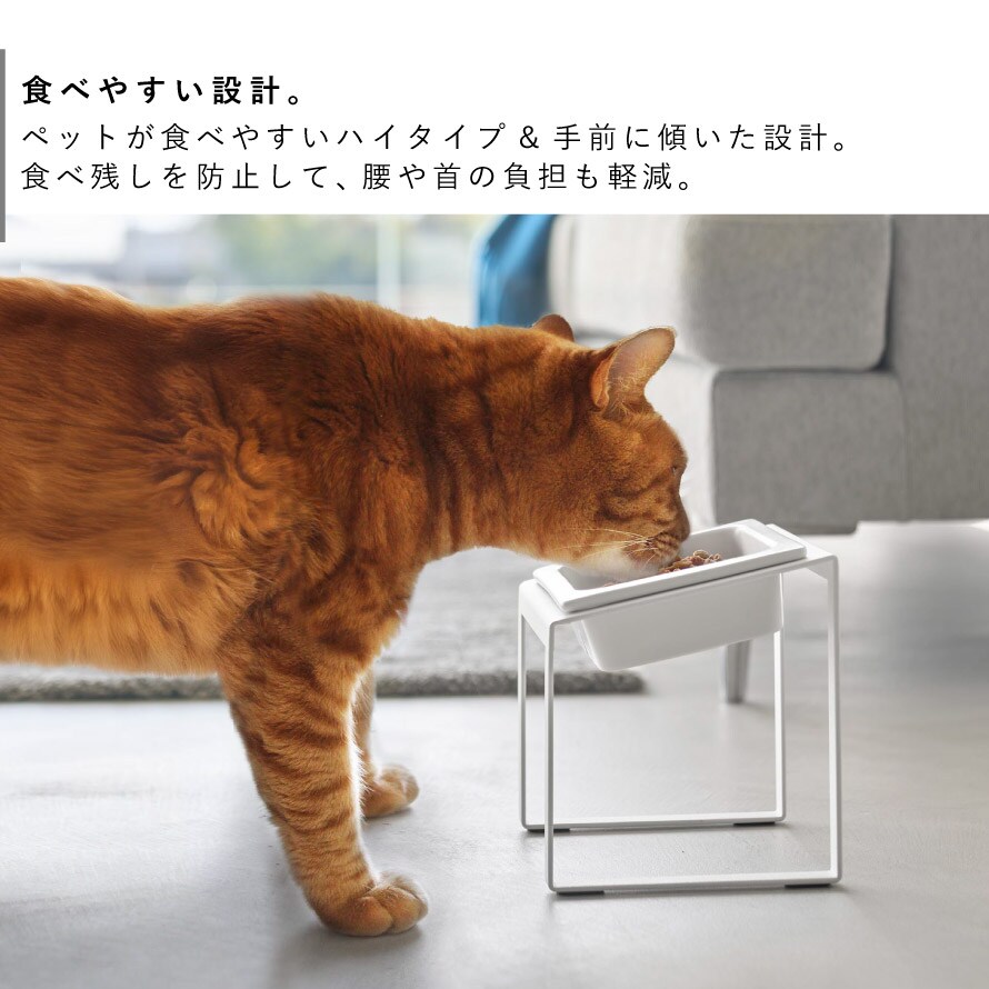 スチール素材のスタンドはペットが食べやすいハイタイプで手前に傾いた設計。首を上げて食べることで気管にもやさしく、腰や首の負担を軽減します。食べ残しの防止にも。