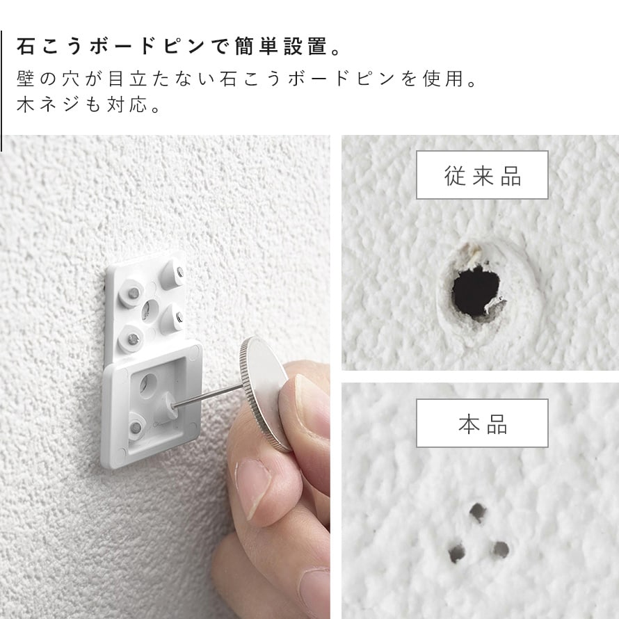 | 取り付け可能な壁 | 石こうボードピン使用時/壁紙・布壁紙・ビニール壁紙貼りなどの石こうボード、薄ベニヤ 木ネジ使用時/柱・板壁(厚さ1cm以上)・プリント合板(裏側に水平にサンがある場所)・裏に下地材(間柱)が入っている壁 |
