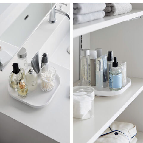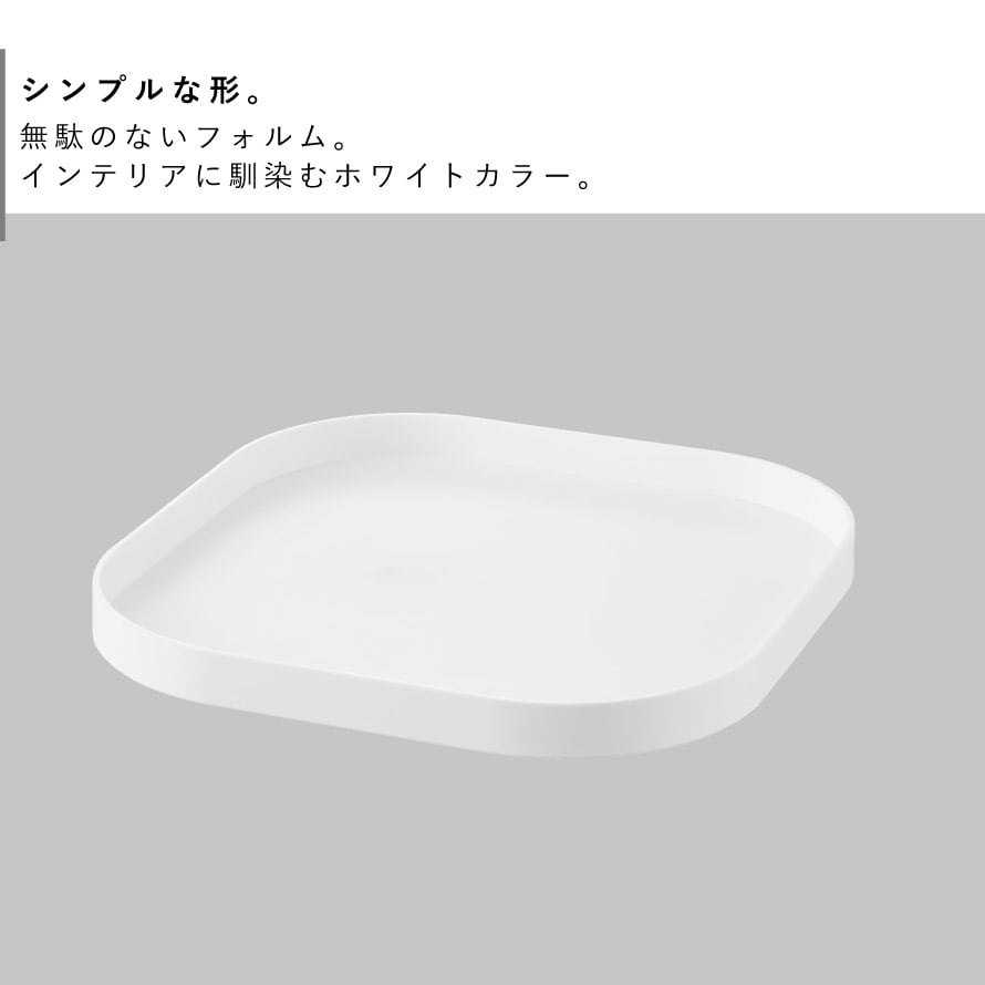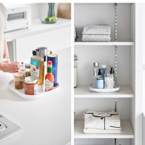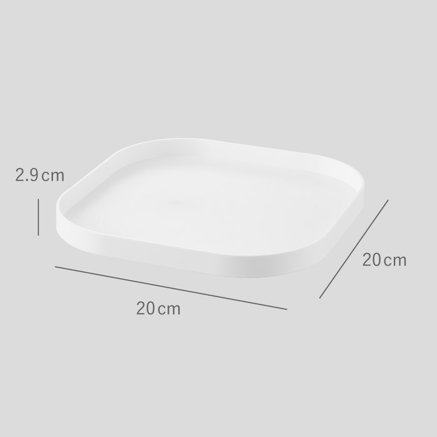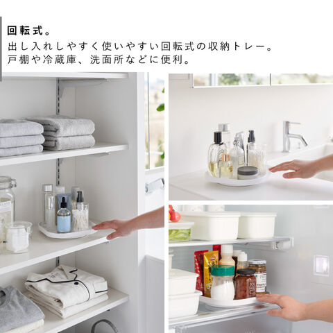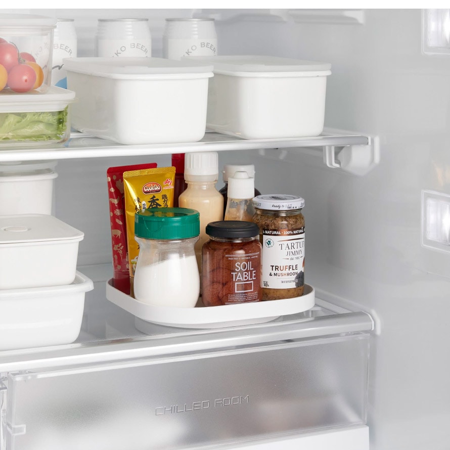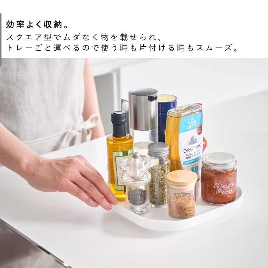 スクエア型でムダなく物を載せられ、トレーごと運べるので使う時も片付ける時もスムーズ。回転させておくのものを取り出しやすく、冷蔵庫や収納棚にも便利。