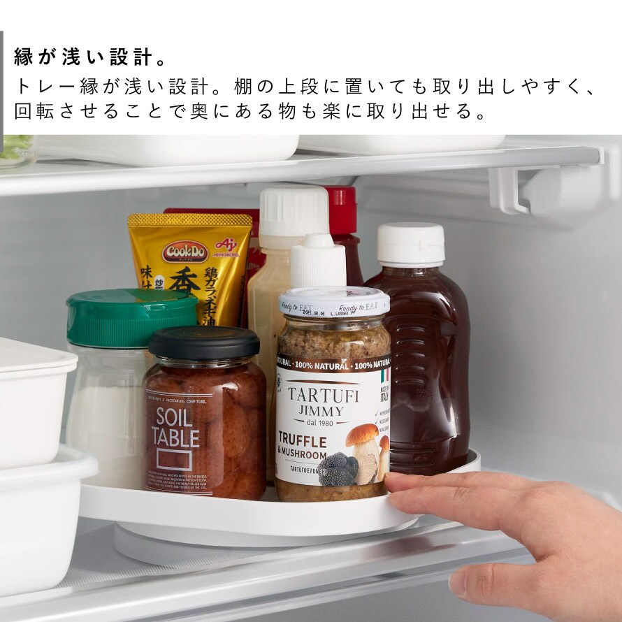 トレーの縁が浅い設計で棚の上段に置いても取り出しやすく、回転させることで奥にある物も楽に取り出すことができて便利です。