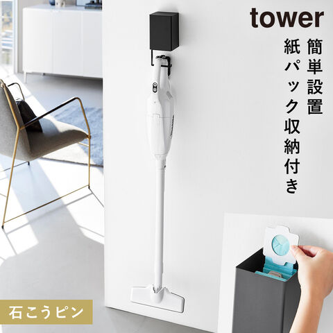 ウォール収納付きコードレスクリーナーホルダー タワー 石こうボード壁対応 山崎実業 tower 掃除機 壁掛け フック スティッククリーナー スタンド おしゃれ モノトーン ホワイト ブラック 10082 10083