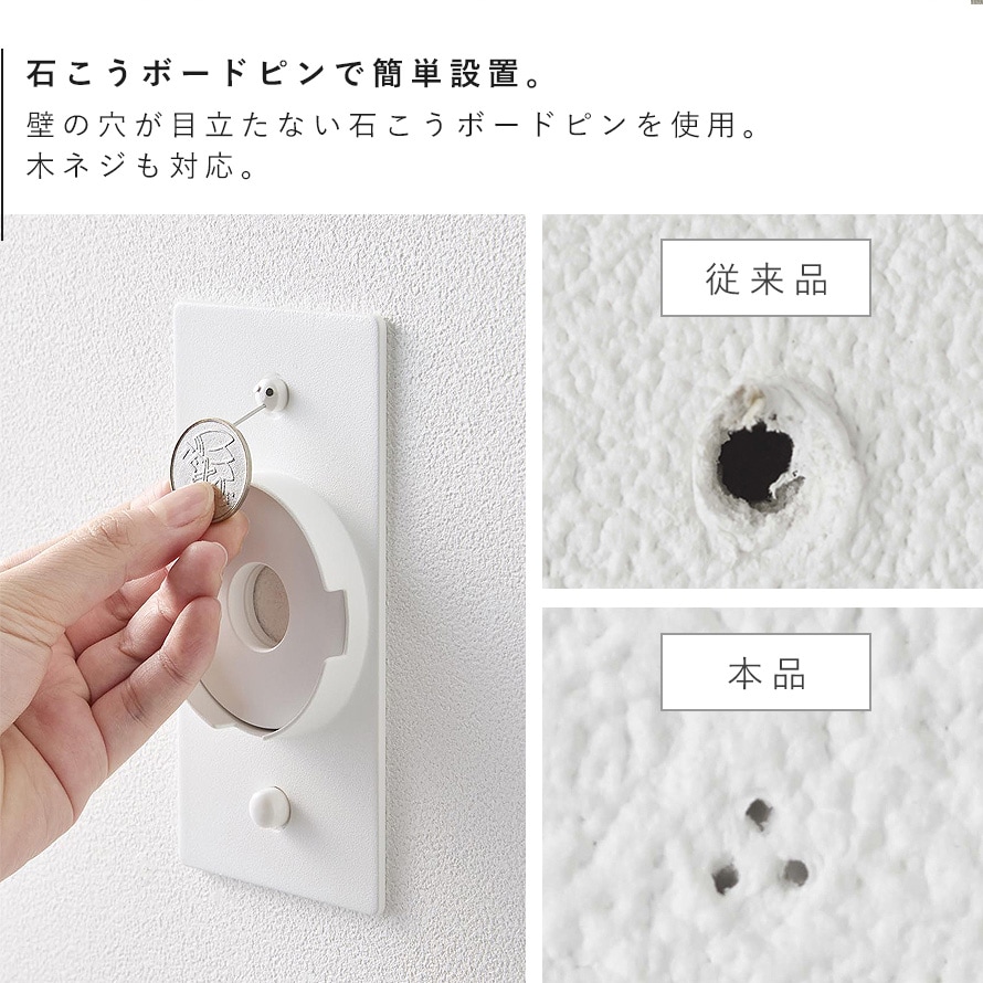 | 取り付け可能な壁面 | 石こうボードピン使用時/壁紙・布壁紙・ビニール壁紙貼りなどの石こうボード、薄ベニヤ 木ネジ使用時/柱・板壁(厚さ1cm以上)・プリント合板(裏側に水平にサンがある場所)・裏に下地材(間柱)が入っている壁 |