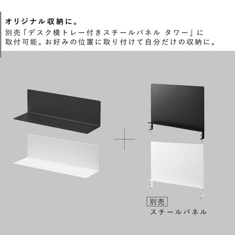 別売りの「デスク横トレー付きスチールパネル タワー」に取付可能の小物棚。一緒に使用すれば、デスク周りをスッキリ整理することができます。