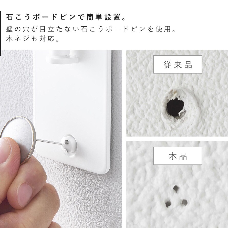 | 取り付け可能な壁 | 石こうボードピン使用時/壁紙・布壁紙・ビニール壁紙貼りなどの石こうボード、薄ベニヤ 木ネジ使用時/柱・板壁(厚さ1cm以上)・プリント合板(裏側に水平にサンがある場所)・裏に下地材(間柱)が入っている壁 |