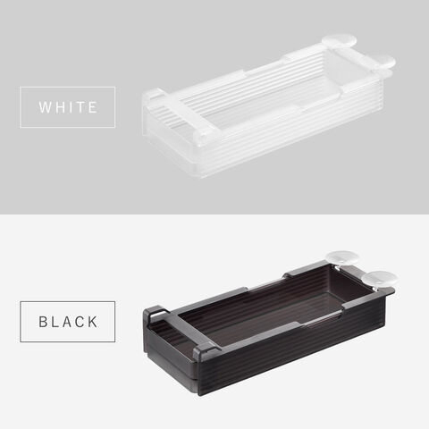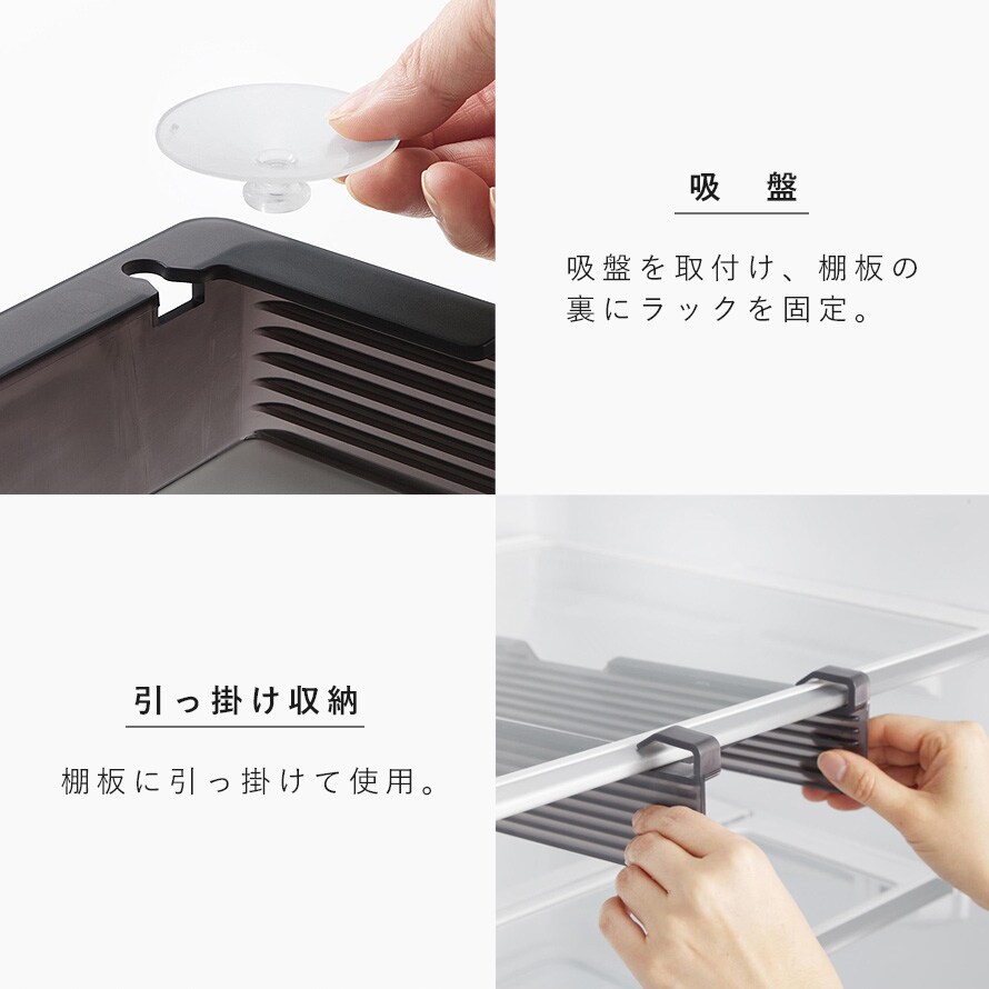 設置は、引っ掛け部を棚板に差し込み、吸盤で固定するだけの簡単仕様。