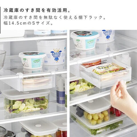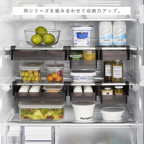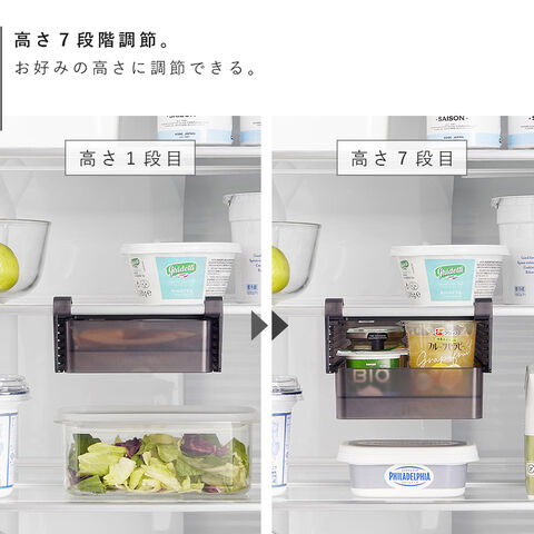 スライスチーズやハムなど高さの低い食品から、ヨーグルトやゼリーなど高さのある食品まで、収納する物に合わせて高さを調節できるので、冷蔵庫の中をスッキリ整理整頓できます。