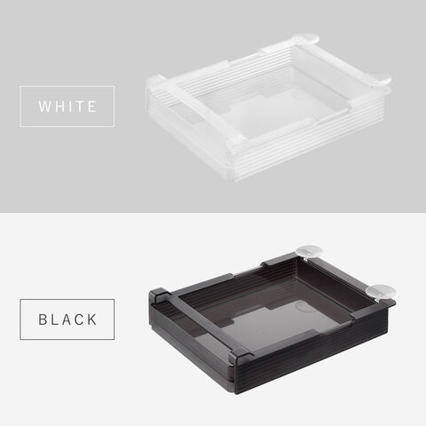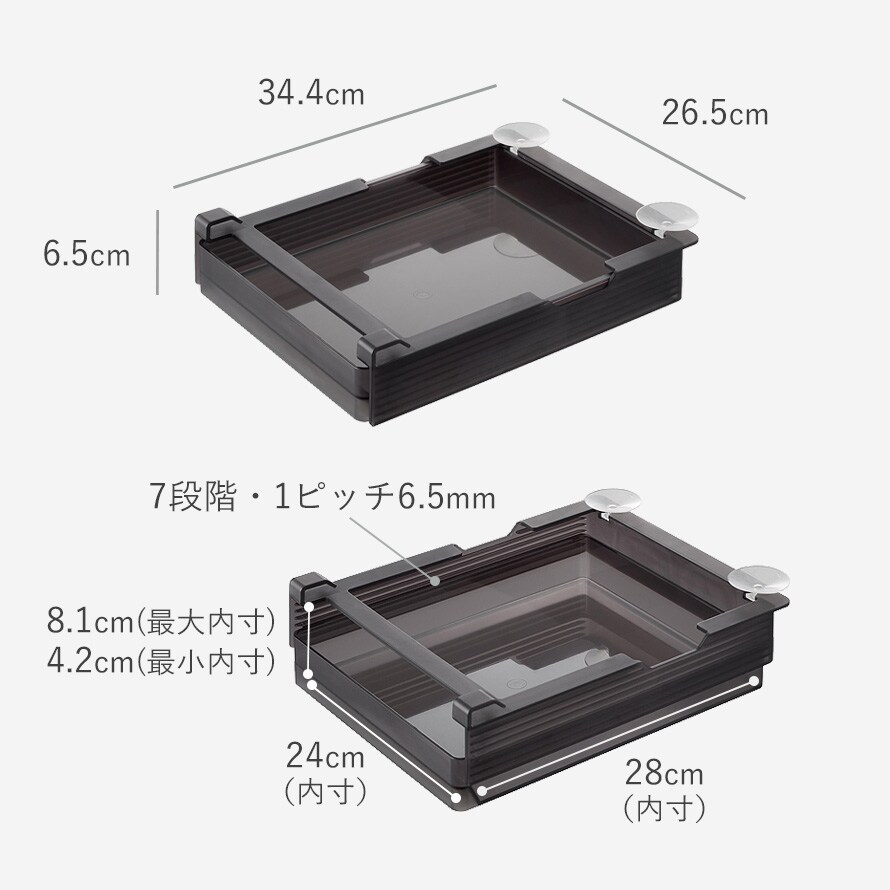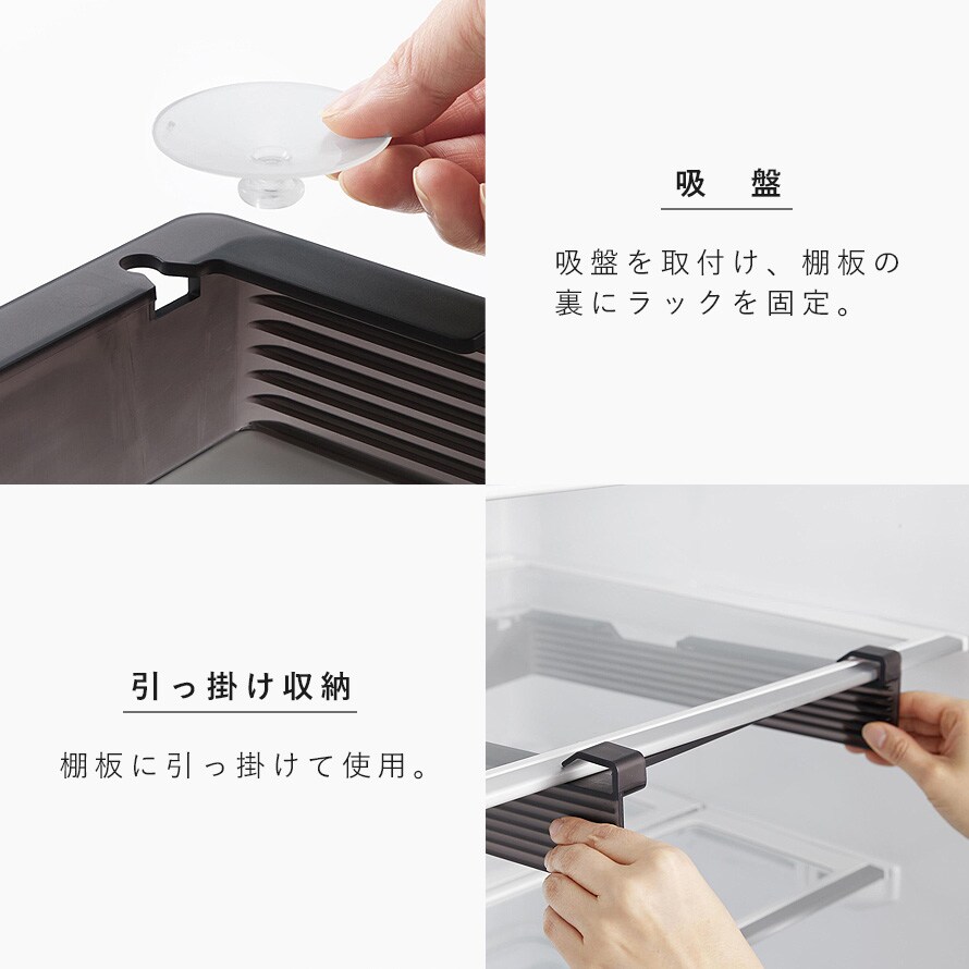 設置は、引っ掛け部を棚板に差し込み、吸盤で固定するだけの簡単仕様。