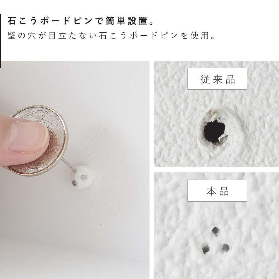 壁の穴が目立ちにくい石こうボードピンで簡単に取り付けることができます。