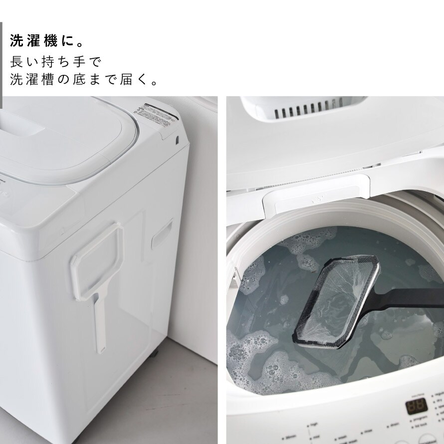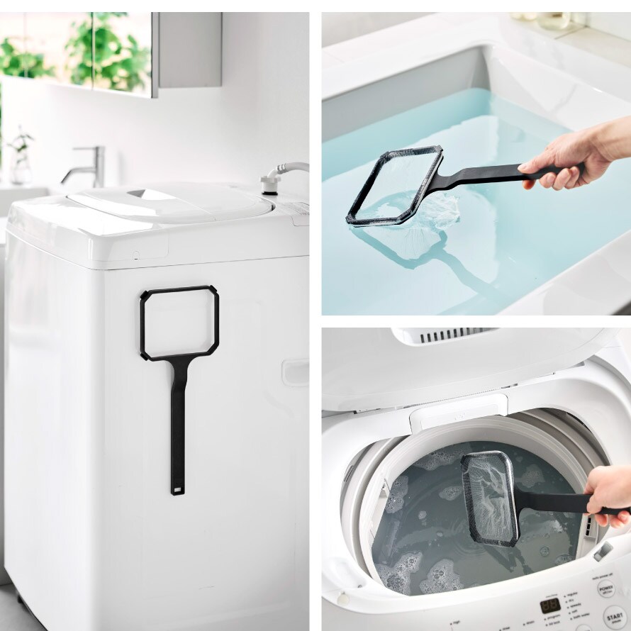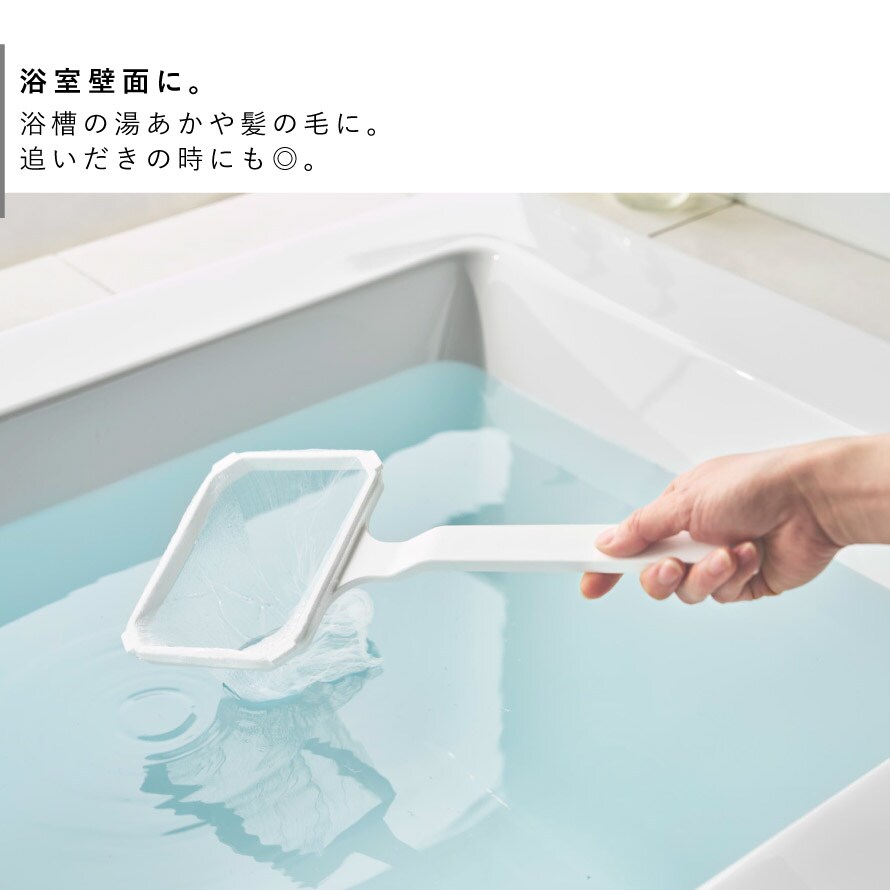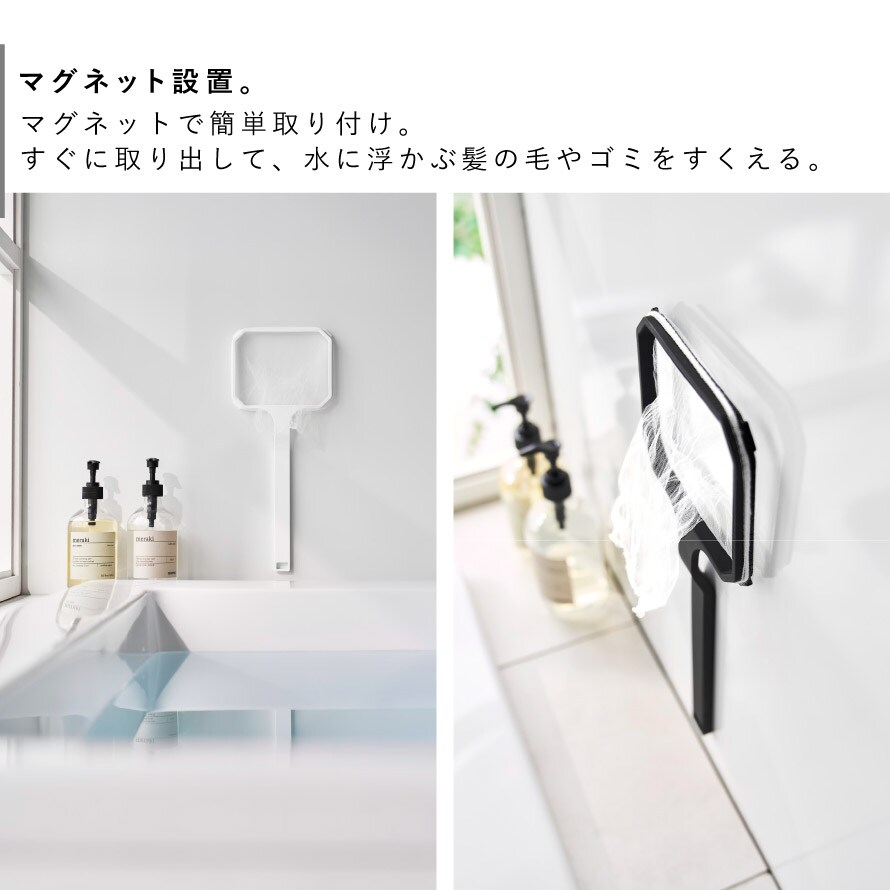 浴室壁面や洗濯機に。マグネットで壁などに接着できるので、すぐに取り出して、水に浮かぶ髪の毛やゴミをすくえます。追いだき機能付きのお風呂の湯あかにも◎。