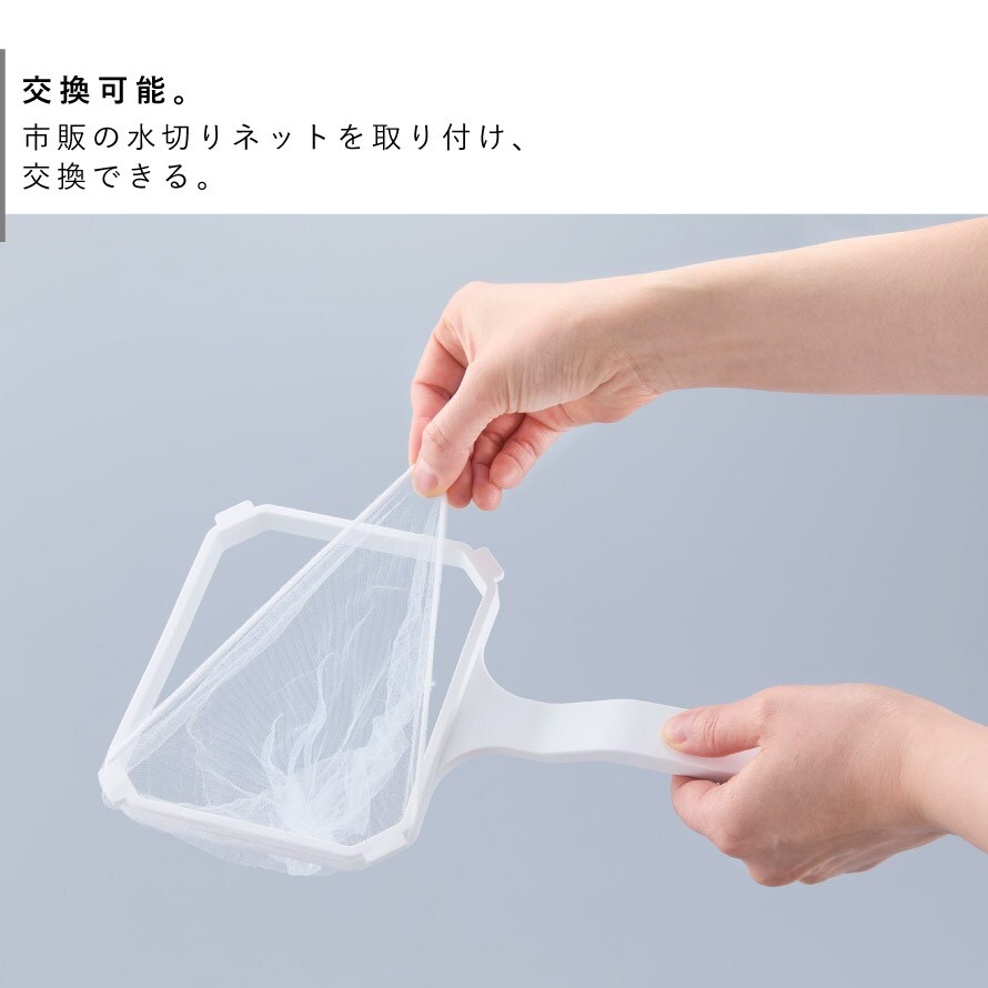 市販の水切りネットを取り付け、交換できます。
