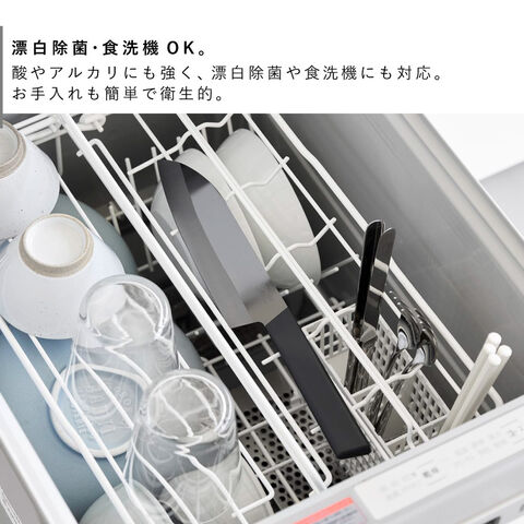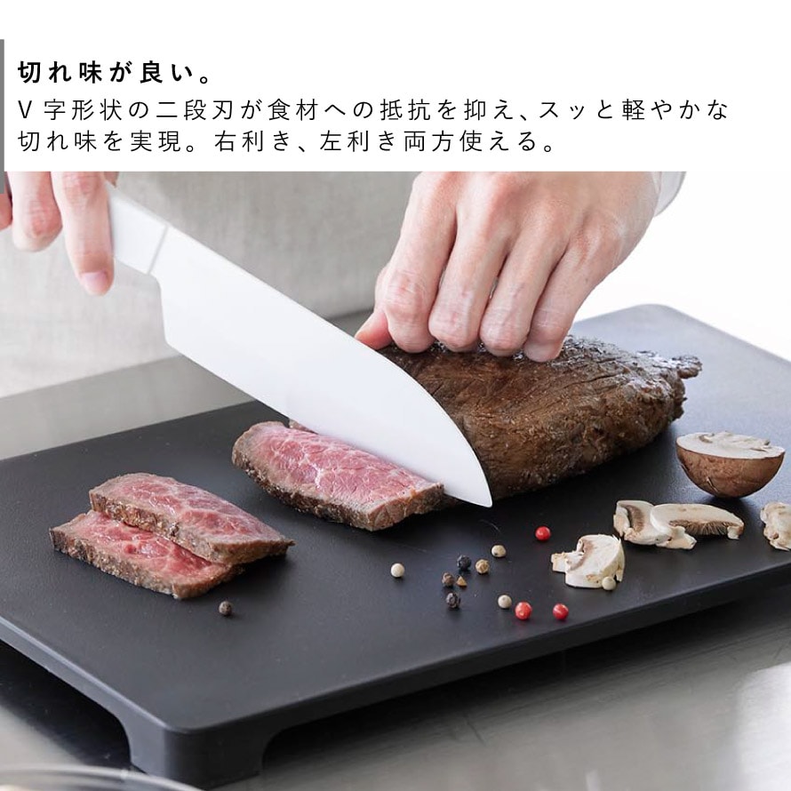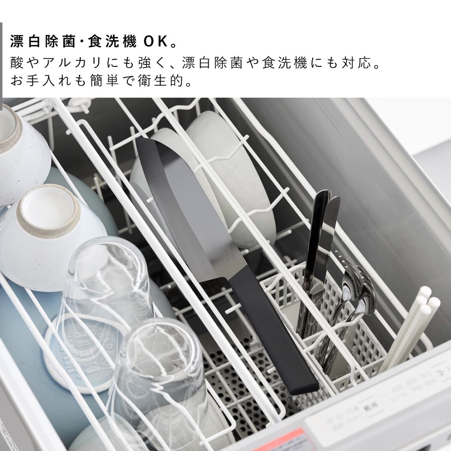 V字形状の二段刃が食材への抵抗を抑え、なめらかで美しい切断面を実現。酸やアルカリにも強く、漂白除菌や食洗機にも対応しているため、お手入れも簡単で衛生的にお使いいただけます。