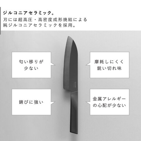 刃には超高圧・高密度成形焼結による純ジルコニアセラミックを採用。刃の密度が高く摩耗しにくいため、鋭い切れ味が長持ちします。錆びに強く、金属アレルギーの心配が少ないのも嬉しいポイントです。