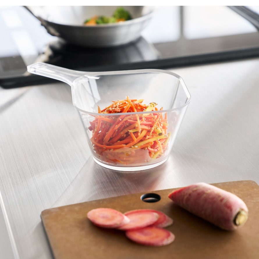 電子レンジOK。メモリ付きで計量できるハンドル付きボウル。