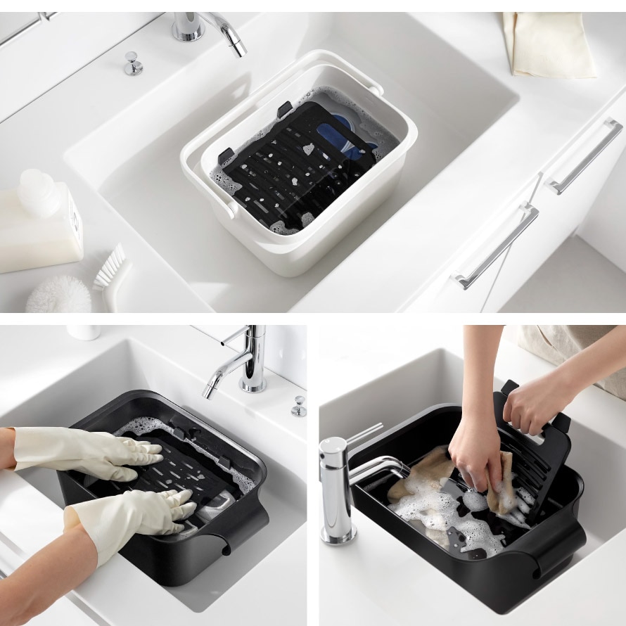 シリコーン製のストッパーを付け替えることで、様々なサイズのバケツに取り付けることができます。ストッパーは上下、左右どちらにも取り付けることができます。