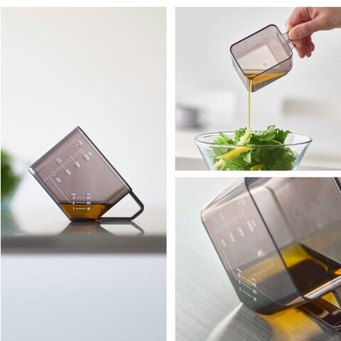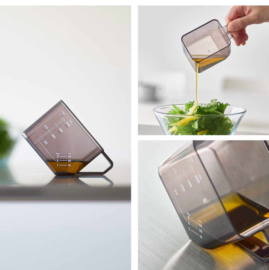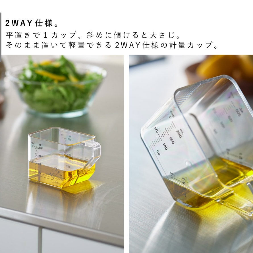 平置きで1カップ、斜めに傾けると大さじが量れる、2WAY仕様の計量カップ。そのまま置いて計量できるので便利。