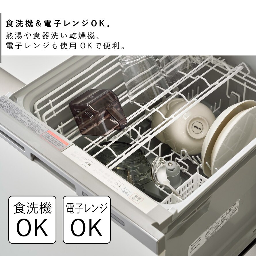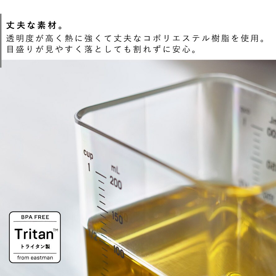 透明度が高く、熱に強くて丈夫なコポリエステル樹脂を使用。目盛りが見やすく、落としても割れずに安心。