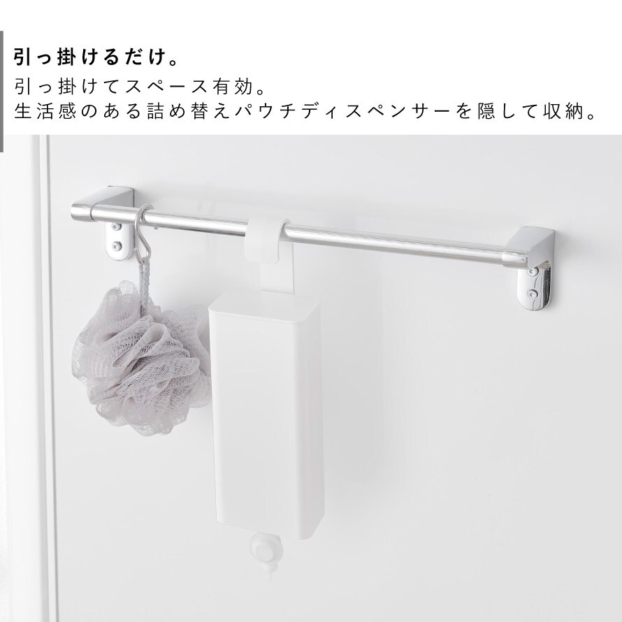 引っ掛けてスペース有効。生活感のある詰め替えパウチディスペンサーを隠してすっきり収納。