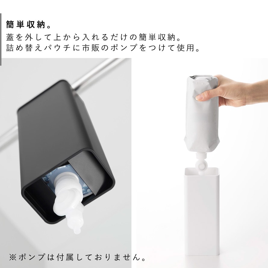市販の詰め替えパウチに、市販のポンプをつけて使用してください。(※ポンプは付属しておりません。)