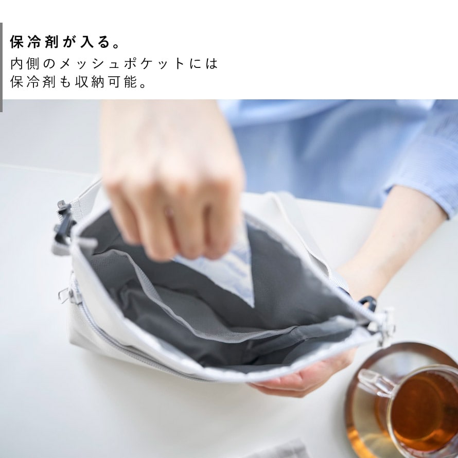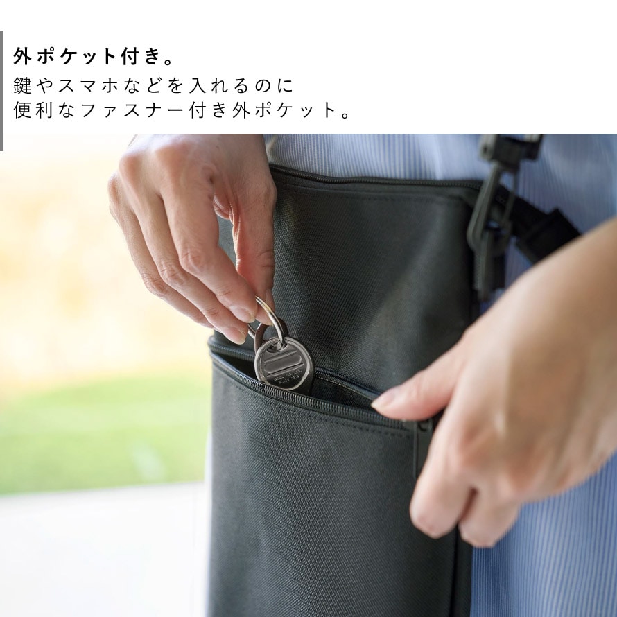 鍵やスマホなどを入れるのに便利なファスナー付き外ポケットもあり、内側のメッシュポケットには保冷剤も収納可能です。