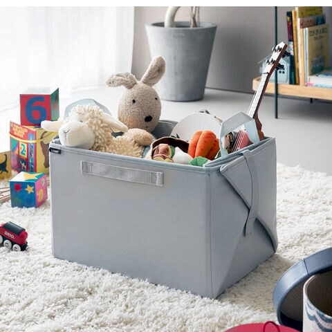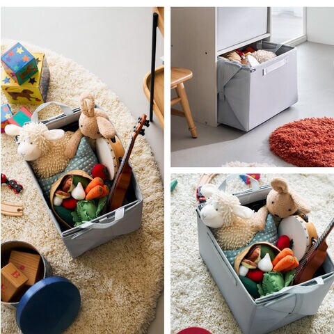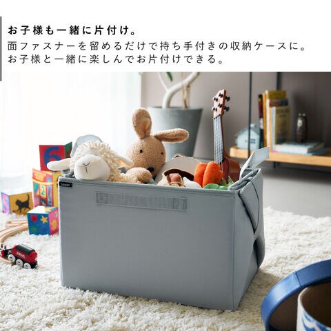 側面の面ファスナーを留めると持ち手付きの収納ケースになるので持ち運びやすく、お子様と一緒に楽しんでお片付けすることができます。
