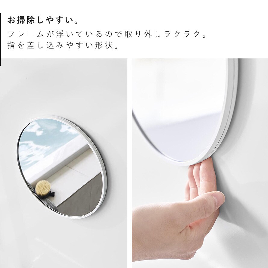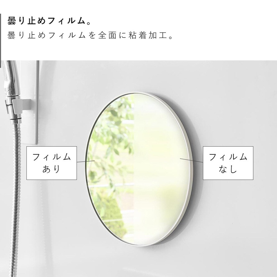 曇り止め加工を施した厚さ6mmの樹脂製バスルームミラーで、ゆがみにくく衝撃にも強い仕様。
