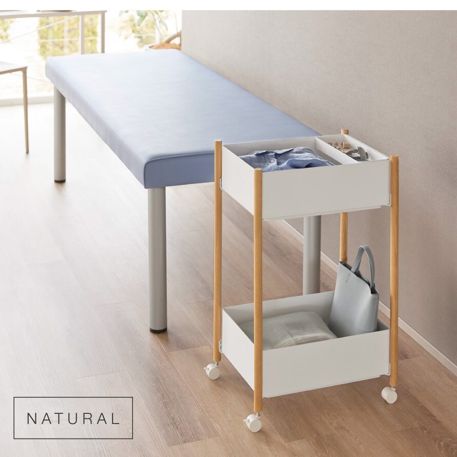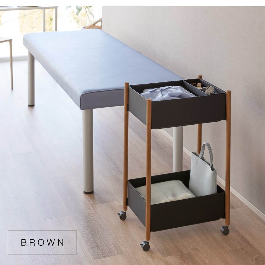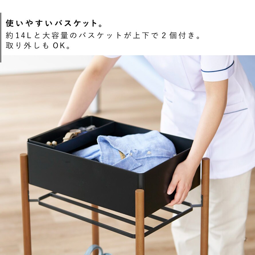 たくさん収納できる2段タイプ。両段に取り外し可能なバスケット付き。バスケットは約14Lの大容量です。クリニックで上段には衣類、下段にはバッグの収納に使用しても。