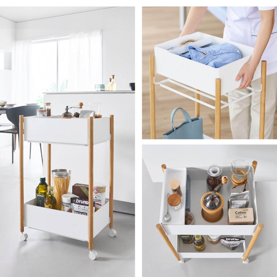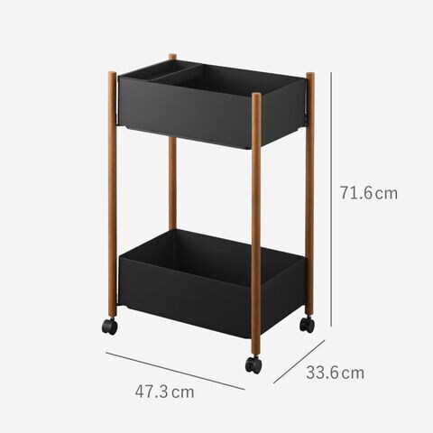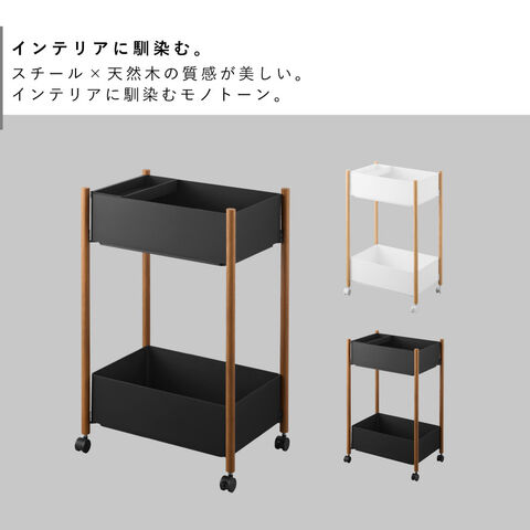 | 材質 | 棚/スチール(粉体塗装)、支柱/天然木(ウレタン樹脂塗装)、バスケット・小物トレー/ABS樹脂、キャスター/ナイロン |