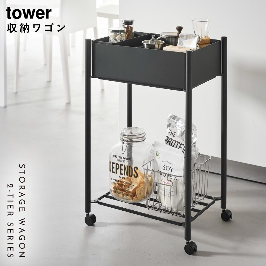 小物トレー付き下段が棚の収納ワゴン 2段 タワー山崎実業 tower ワゴン キャスター付き サロン 2段 スリム おしゃれ モノトーン ホワイト ブラック 10185 10186