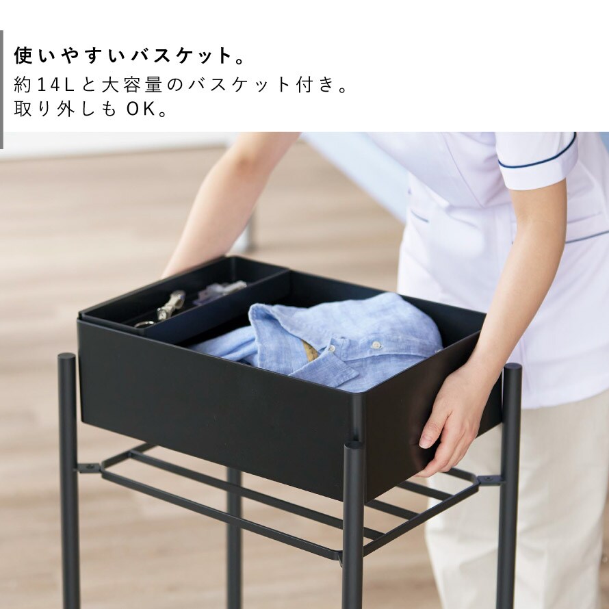 たくさん収納できる2段タイプ。上段に取り外し可能なバスケット付き。バスケットは約14Lの大容量です。下段はワイヤー棚になっており、靴などの収納に最適。