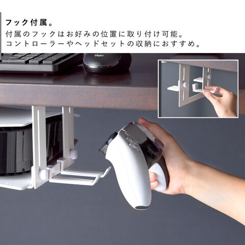 付属のフックはお好みの位置に取り付け可能。コントローラーやヘッドセットの収納におすすめです。