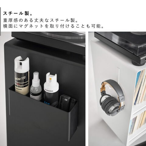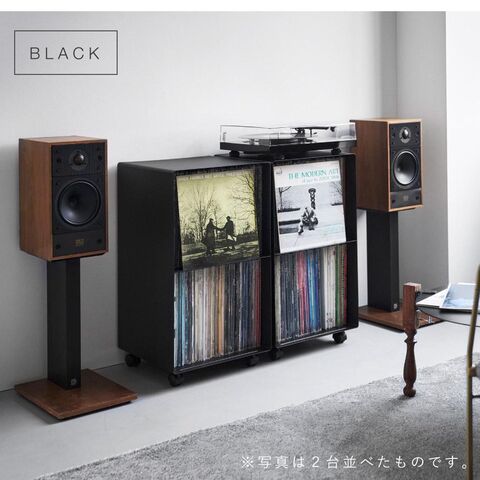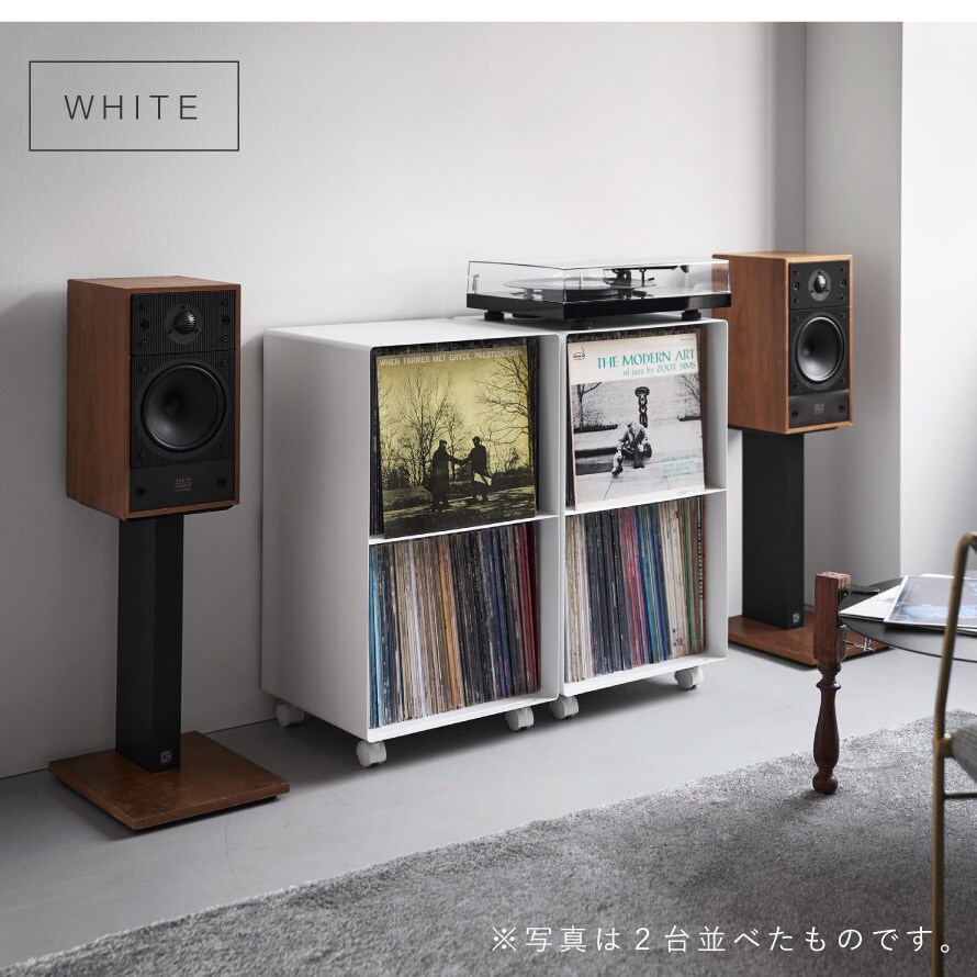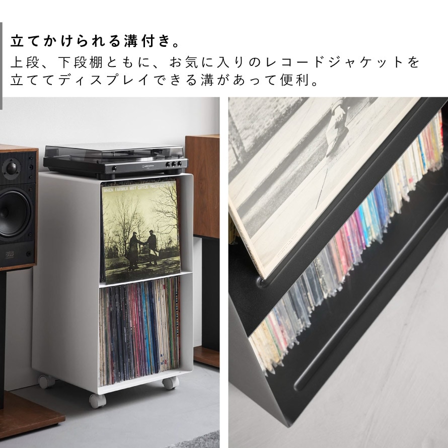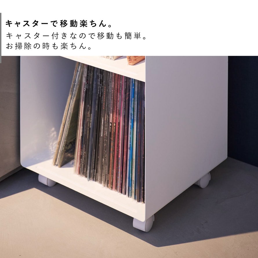 一段あたり最大70枚のレコードが収納可能。(※レコードのサイズや厚さ、形状によっては収納できない場合もあります。)スチール製キャスター付きラック。