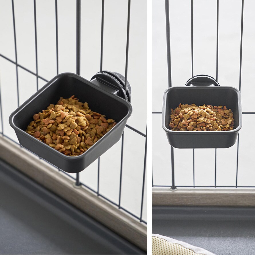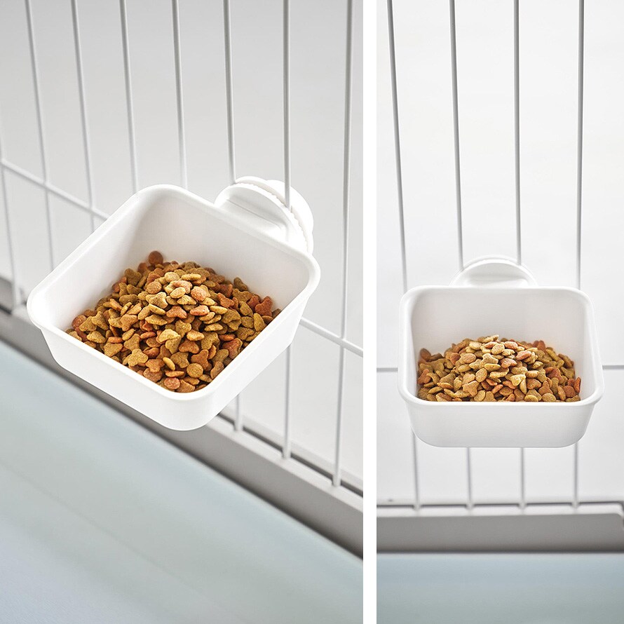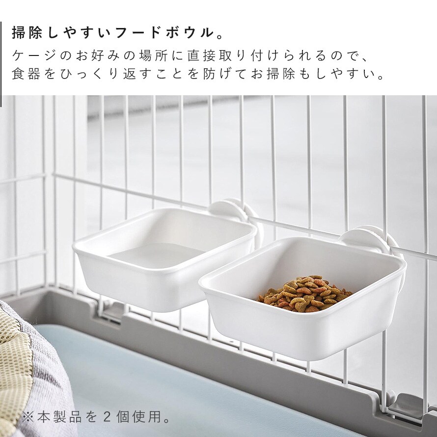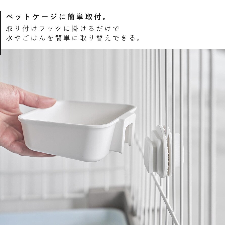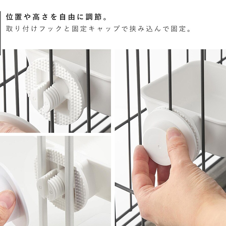 ボウルは取り付けフックに掛けるだけで簡単に着脱でき、ケージの外側や別売の「ペット用ボトル給水器スタンド ヌークス」にも取り付けできます。