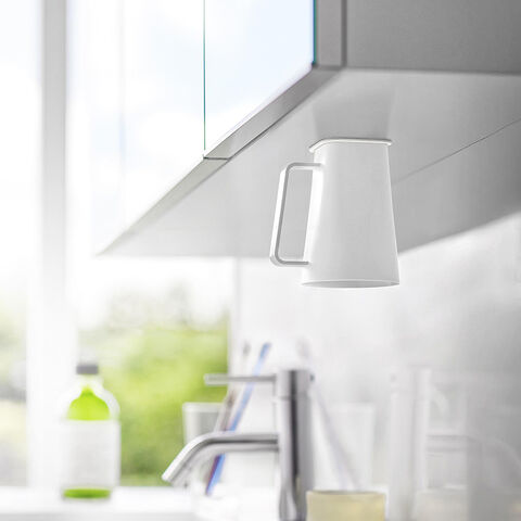 フィルムシートを吊り戸棚下などに貼り付けて、マグネットタンブラーを浮かせて収納!