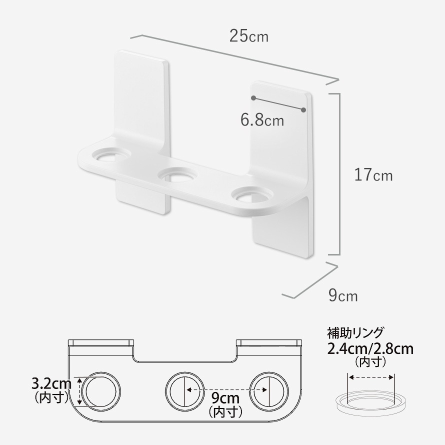 | 対応サイズ | ディスペンサーのねじ込み部分/直径2.4~3.2cm ボトルのサイズ/直径9cm以下 ※サイズや形状によっては収納できない場合もあります。※容量約500mLのボトルを想定しています。 |