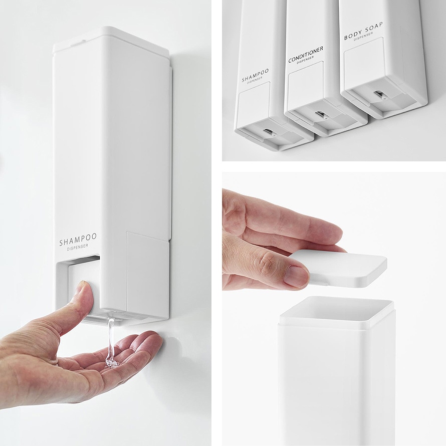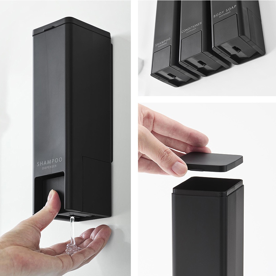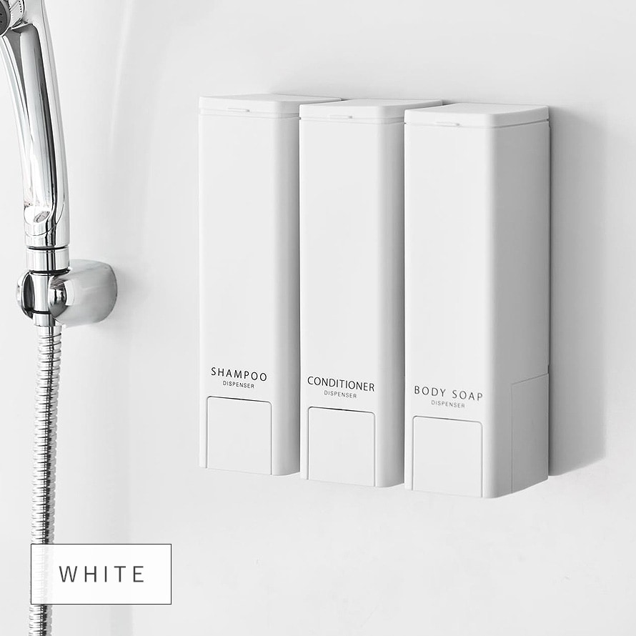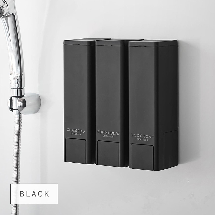 「SHAMPOO」「CONDITIONER」「BODYSOAP」の3種類、カラーはホワイトとブラックからお選びいただけます。