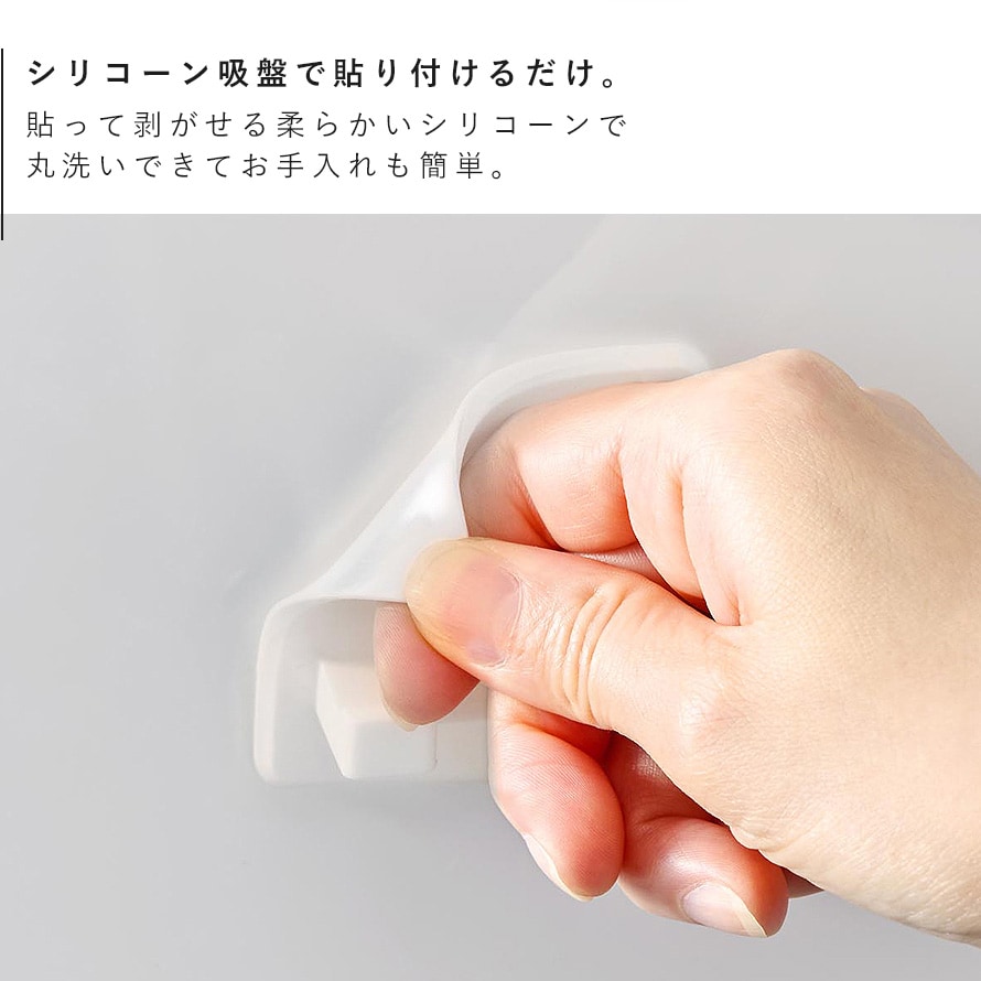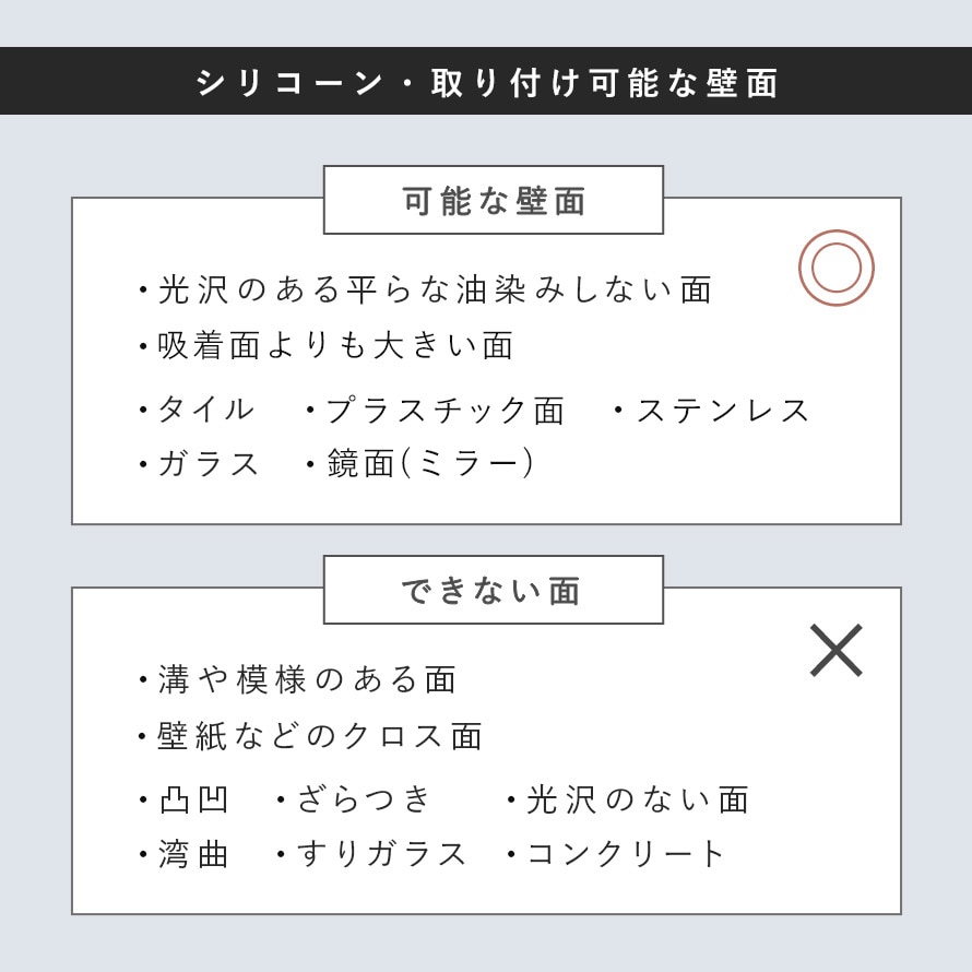 | 使用できる面 | 光沢のある平らな油染みしない面で吸着面よりも大きい面(タイル・プラスチック・ステンレス・ガラス・鏡面(ミラー)) ※表面加工・材質・状態などによっては貼り付けできない場合があります。 |