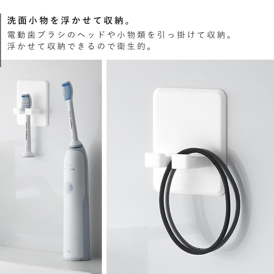 電動歯ブラシのヘッドや、ヘアゴムなどの小物類も引っ掛けて収納できます。