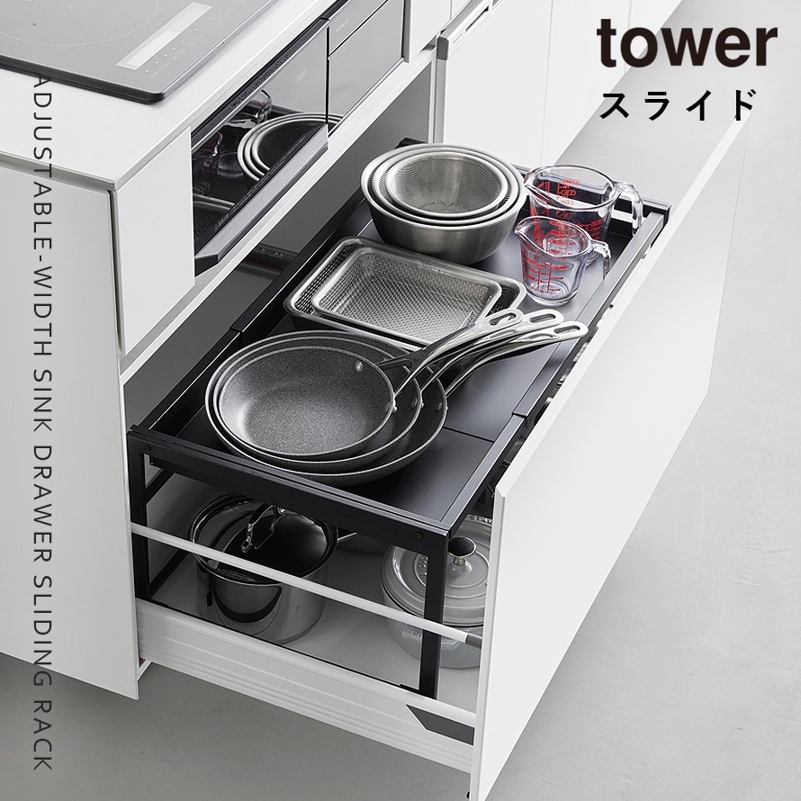 シンク下引き出し幅伸縮スライドラック タワー D40 山崎実業 tower キッチン 引き出し 伸縮 スライドラック おしゃれ モノトーン ホワイト ブラック 10358 10359