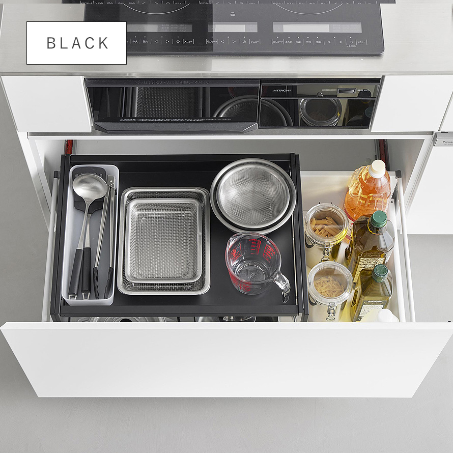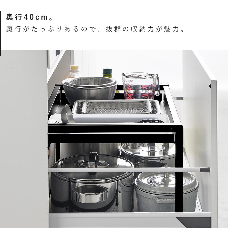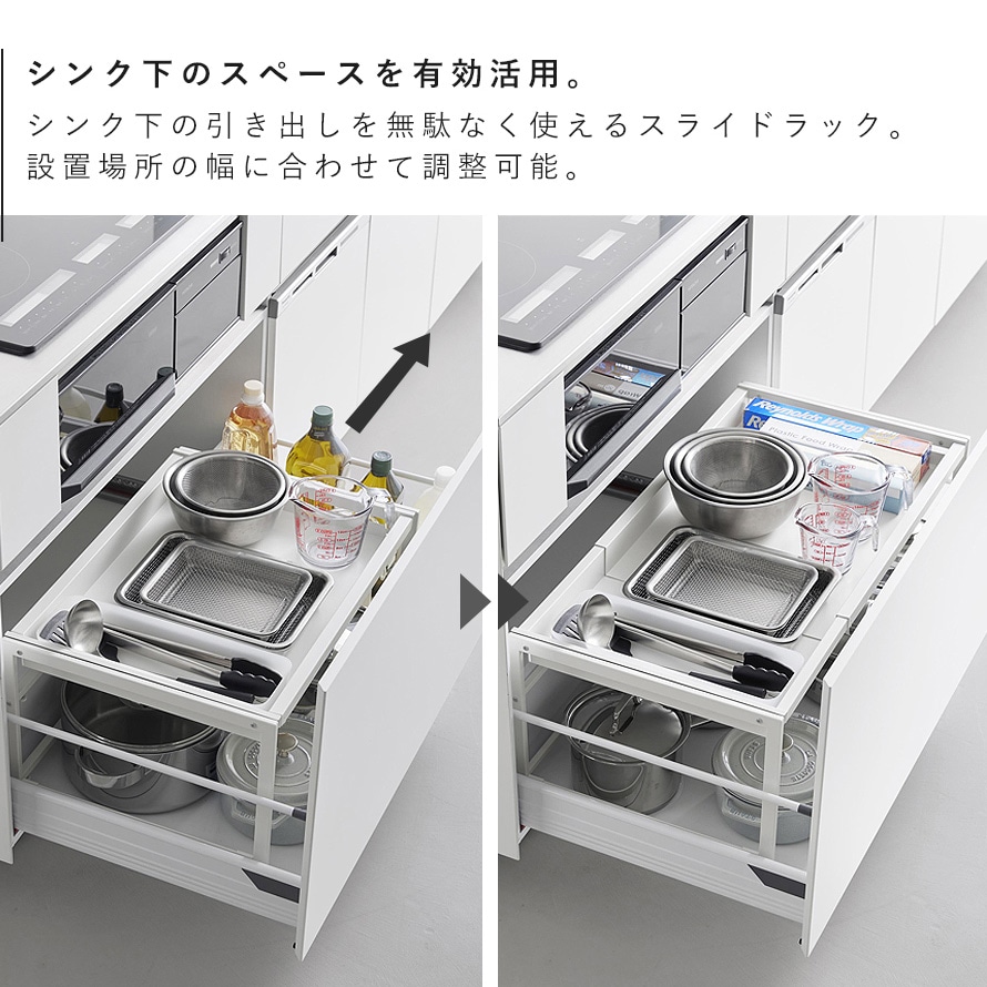 シンク下の引き出し中スペースを有効活用できる、奥行き40cmの伸縮スライドラックです。