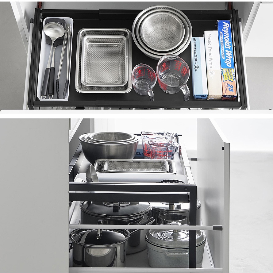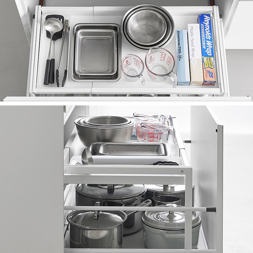 ごちゃっとしがちなシンク下を、すっきり収納できるスライドラックはいかがですか。