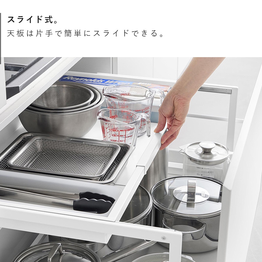 天板は片手で簡単にスライドでき、奥へスライドさせることで下に収納した物もスムーズに取り出せます。