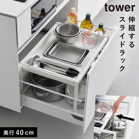 シンク下引き出し幅伸縮スライドラック タワー D40 山崎実業 tower キッチン 引き出し 伸縮 スライドラック おしゃれ モノトーン ホワイト ブラック 10358 10359