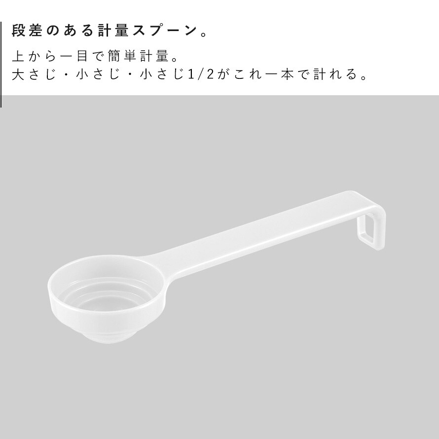 段差メモリで大さじ・小さじ・小さじ1/2 がこれ1本で計量可能。